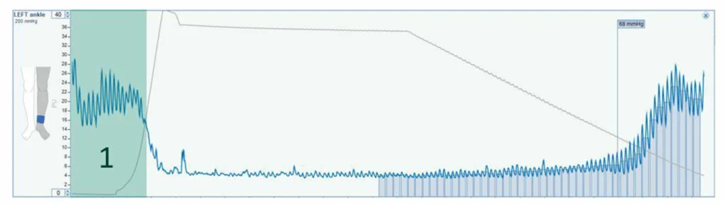 Figure (a) is a screenshot from our PeriFlux 6000 ABI protocol. It shows the baseline ankle pressure (area 1) before occlusion. This is not merely a starting point; it provides meaningful clinical context. For example, a PU below 20 may indicate underlying pathology such as microvascular disease or ischemia.