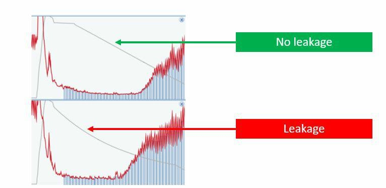 A non-linear cuff-pressure curve, as shown in the reference diagram, indicates an air leak, which needs to be corrected to ensure a valid ABI reading.