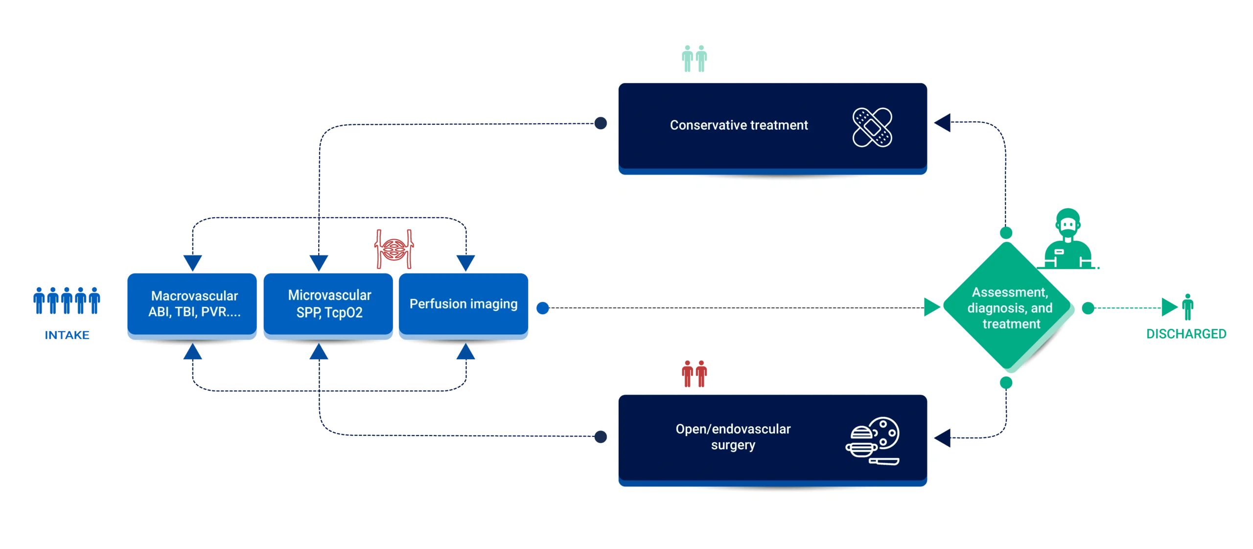As patients are referred, our solutions provide both macrovascular insights to support diagnosis of vascular diseases such as PAD and CTLI and microcirculation insights for tissue viability and wound healing potential. For patients with amputated toes or non-compressible arteries, skin perfusion pressure (SPP) or transcutaneous oxygen (TcpO2) offer reliable alternatives to ABI and TBI.